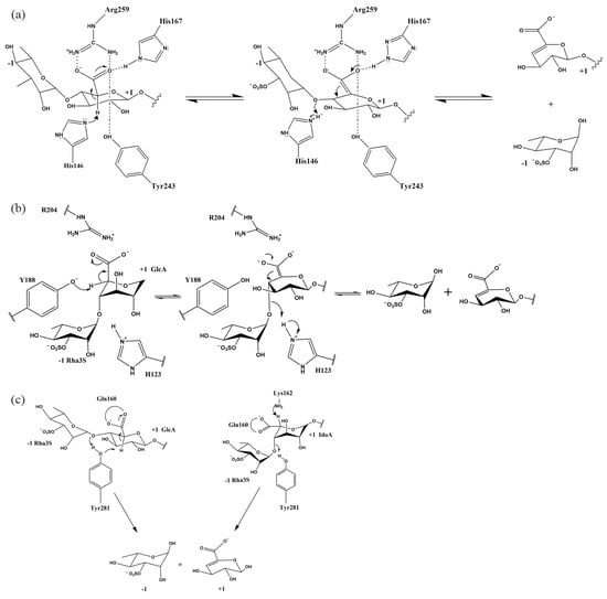 The catalytic mechanisms of the PL24, PL25, and PL28 families have been proposed based on the crystallography analysis and mutation experiments. Within the PL24 family, residues Arg259 and His167 form hydrogen bonds with the GlcA carboxyl group at the +1 position, which neutralizes the negative charge on the carboxyl group of the substrate uronic acid (Figure 5a) [70]. In addition, residue Tyr243 also interacts with the carboxyl group of GlcA. Therefore, these three residues achieve neutralization of the charge on the carboxylate, which reduces the pKa of the C5 proton of +1 position monosaccharide. Residue His146 serves as a base to abstract the C5 proton. On the other hand, His146 also acts as an acid to provide proton, thereby facilitating the formation of double bonds between C4 and C5 and breaking of glycosidic bonds. The mutational experiments provided insights into the distinct roles played by three residues in neutralizing the carboxyl group’s negative charge. Inactivation of the R259A and H167A mutants highlighted the crucial roles of Arg259 and His167 in neutralizing the carboxyl group’s negative charge. The Y243F mutant, while showing residual activity, indicated that residue Tyr243 plays a supportive rather than a primary role in carboxyl group neutralization. Furthermore, the loss of enzymatic activity in the R320N mutant suggests that the arginine mutation at position 320 may cause the Arg259 side chain to deviate towards the main chain Gly262-Asn263. This deviation likely triggers subtle rearrangement in the protein structure, which can result in Arg259 being unable to neutralize the acidic group of GlcA in the substrate and hindering the extraction of the C5 proton. This indirectly suggests the importance of Arg259 in charge neutralization.