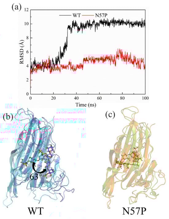 The substrate along with the 100 ns MD simulations of WT and mutant N57P. (a) The RMSD of the substrate in WT and N57P from the MD simulations; (b) the protein and substrate structures of WT at 0 ns and 100 ns, the complex structure of 0 ns was shown in cyan, structure of 100 ns was shown in purple; (c) the protein and substrate structures of N57P at 0 ns and 100 ns, the structure of 0 ns was shown in orange, structure of 100 ns was shown in pale green.