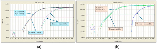 - Mendonça, J.F.M.d.; Vieira, F.d.O.; Fonseca, I.; Ribeiro, J.B.; Arcuri, E.F.; Borges, M.d.F.; Borges, C.A.V.; Sá, J.F.O.d.; Martins, M.F. Detection of viable Salmonella Typhimurium and Staphylococcus aureus in Coalho Cheese by Real-Time PCR. Food Sci. Technol. 2019, 39, 690–696. [Google Scholar] [CrossRef]