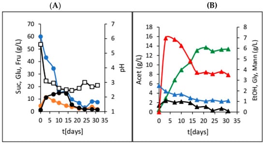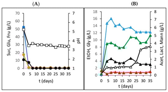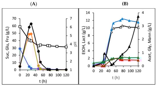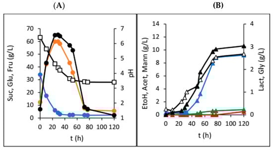 Changes in concentration of sugars and pH (A) sucrose (●; Suc), glucose (●; Glu), fructose (●; Fru), and pH (□) and fermentation products (B) ethanol (▲; EtOH), glycerol (▲; Gly), acetic acid (▲; Acet), and mannitol (▲; Mann) during water kefir production in jars with the addition of 10 g of dried pitted plums.