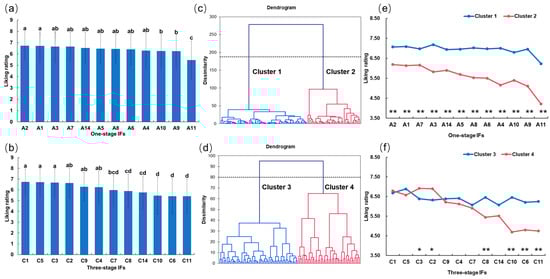Mean preference ratings for 12 batches of (a) one-stage IFs and (b) three-stage IFs from 100 consumers. Different letters in the column indicate significant differences among samples at the level of p < 0.05. AHC results of preference data for 12 batches of (c) one-stage IFs and (d) three-stage IFs. Mean preference ratings for 12 batches of (e) one-stage IFs and (f) three-stage IFs of the two identified consumer clusters. p < 0.01 **; p < 0.05 *.