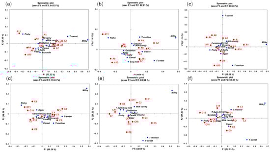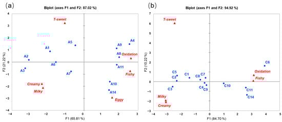 The one-stage samples were most differentiated by the “milky” and “fishy” aroma due to their significant positive and negative correlations along the first dimension (F1 explained 77.33% of the total variance) of the symmetric plot (Figure 2a). The two attributes “milky” and “T-sweet” on the right side (contributions of 50.1% and 15.9%, respectively) and “fishy” on the left side (contribution of 26.5%) contributed greatly to forming the first axis. Therefore, samples located on the right side were mainly positively correlated with “milky” aromas and “T-sweet” tastes, like A2, A1, and A3. A2 had the highest positive quotes for both “milky” aroma (35) and “T-sweet” taste (20). These samples were opposed to the other samples that were characterized as “fishy”, with 66 positive quotes for A11 followed by A9 and A10. In addition, A9, A10, and A11 were positively correlated with the aroma attributes “eggy” and “oxidation” and the flavor term “T-salty”.