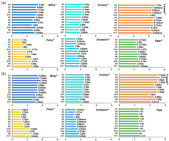 In the case of one-stage IFs, the mean scores for the “milky” aroma ranged from 3.86 to 5.09, indicating that the intensity of the “milky” aroma was either slightly weak or moderate (Figure 3a). The highest “milky” aroma was observed in A2, A3, and A6, which exhibited significantly higher scores than the other one-stage IFs. Conversely, the lowest “milky” aroma was found in A4, which had a score below 4. The mean scores for the “creamy” aroma of one-stage IFs exhibited a range of 2.68 to 3.59, indicating a relatively weaker intensity. A3 and A2 had the highest “creamy” aroma, significantly higher than other one-stage IFs. All one-stage IFs displayed a higher intensity of “T-sweet”, with mean scores ranging from 5.95 to 7.23. The highest level of “T-sweet” taste was observed in A2, followed by A5, while A14 was found to exhibit the lowest “T-sweet” taste. The “fishy” aroma exhibited the greatest variation among one-stage IFs with different storage periods, with scores between 1.64 and 4.00. Among all one-stage IFs, A11 achieved the highest score of 4.00 for “fishy” aroma. Additionally, A4, A14, A10, A8, and A9 showed significantly higher scores for “a fishy” aroma than the other one-stage IFs. In contrast, A1, A2, and A3 were observed to have the weakest “fishy” aroma, with scores below 2. All one-stage IFs achieved low scores for the “oxidation” aroma, below 3, with relatively higher scores observed in A4 and A8. This was similar to the results obtained in the consumer-based Pivot Profile (Supplementary Table S2). A14 and A10 were found to possess significantly higher “eggy” aromas than the other one-stage IFs. Conversely, A1 exhibited the lowest degree of this aroma, followed by A3.