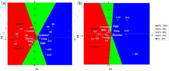 In the case of three-stage IFs, C1, C2, C3, C4, C5, C7, and C8 were preferred by both cluster 3 and cluster 4, and they were preferred by 80% to 100% of consumers in both clusters (Figure 5b). These three-stage IFs were positively correlated with “creamy” and “milky” aromas, together with “T-sweet” taste. Conversely, all consumers had the least liking for C6, C10, C11, and C14, which they attributed with “fishy”, “oxidation”, and “eggy” aroma attributes.