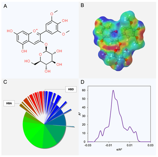 Chemical structure (A), charge distribution (B,C), and σ-profile of the malvidin-3-glucoside (D). Note: In Figures (C,D), red and blue colors are related to the HBA and HBD regions of the molecule, respectively. The green color is related to the neutral area.
