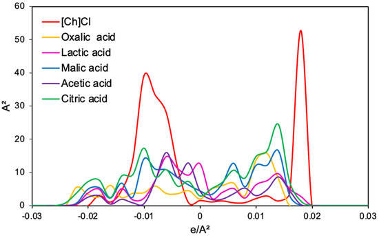 σ-profile of eutectic mixtures precursor: choline chloride ([Ch]Cl, HBA) and HBD (oxalic, lactic, malic, acetic, and citric acids).