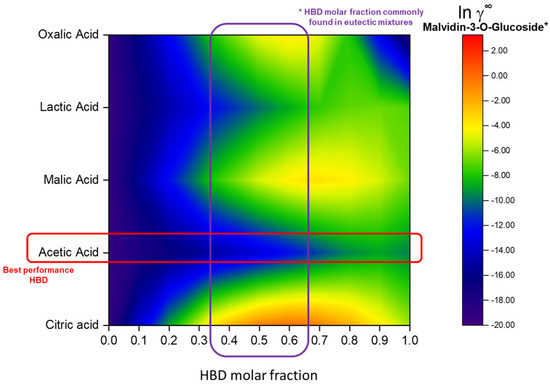 The properties of the malvidin-3-glucoside and other anthocyanins were considered for the solvent choice, and the screening was carried out using eutectic mixtures based on organic acids as solvents. This class of compounds was chosen considering reports in the literature of eutectic mixtures composed of organic acids, as HBD presented a significantly higher capacity to dissolute and extract anthocyanins than other classes of HBD [43,44]. This can be attributed to the low pH values of the acid-based DES, which improve its ability to solubilize polar and nonpolar compounds due to the high capacity to donate protons and accept electrons [45].
