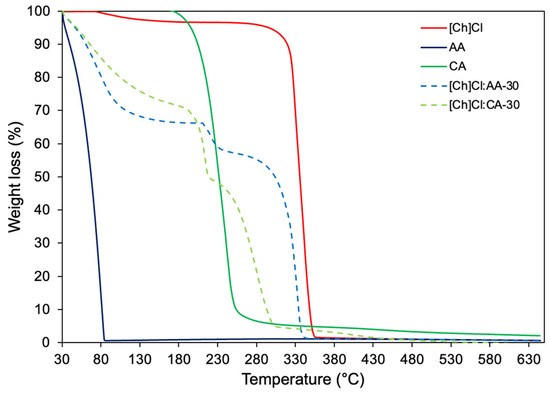 The TGA analysis was carried out to measure the thermal stability of the eutectic mixtures. For process purposes, thermal stability is essential in knowing the temperatures where materials do not suffer degradation or significant damage to their physical–chemical properties. Figure 4 shows the thermal degradation of the acetic acid, citric acid, choline chloride, and respective eutectic mixtures under evaluation. At 84 °C, the AA is completely degraded, while CA and [Ch]Cl degradation initiate at 180 and 300 °C, respectively. For the eutectic mixtures, two events are seen; the first one, around 100 °C, is related to the water added to the mixtures. The second one, for both of them, initiates around 230~240 °C until complete degradation of the solvent.