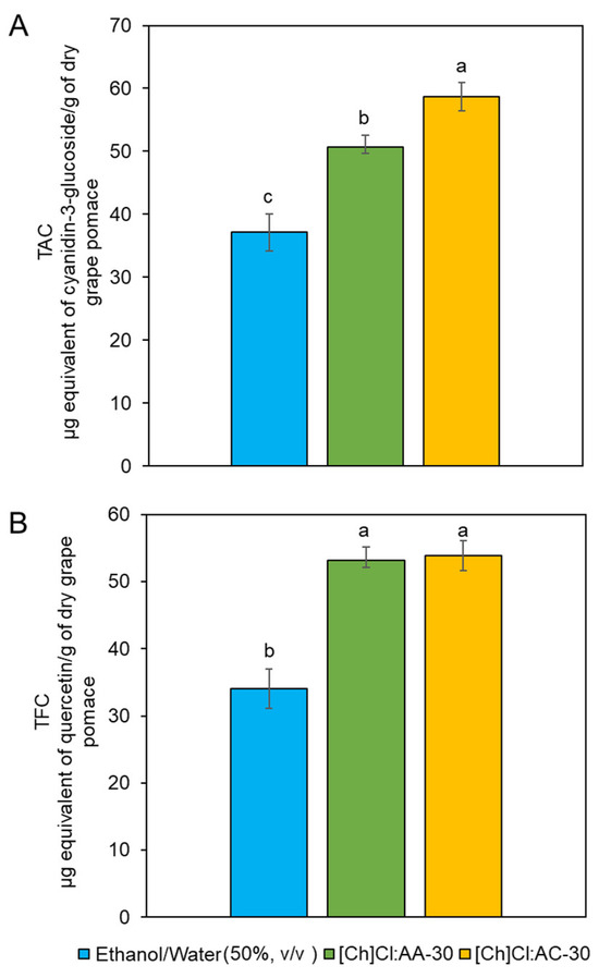 Extraction yields for the three solvents under evaluation. The extraction conditions were 45 °C, a solid/solvent ratio of 1:30, 10 min, and Ultra-Turrax stirring of 5000 rpm. (A) Total anthocyanin content (TAC) µg equivalent of cyanidin-3-glucoside/g of dry grape pomace. (B) Total flavonoid content (TFC) µg equivalent of quercetin/g of dry grape pomace. Note: Different letters represent significant differences according to the Tukey test (p < 0.05).