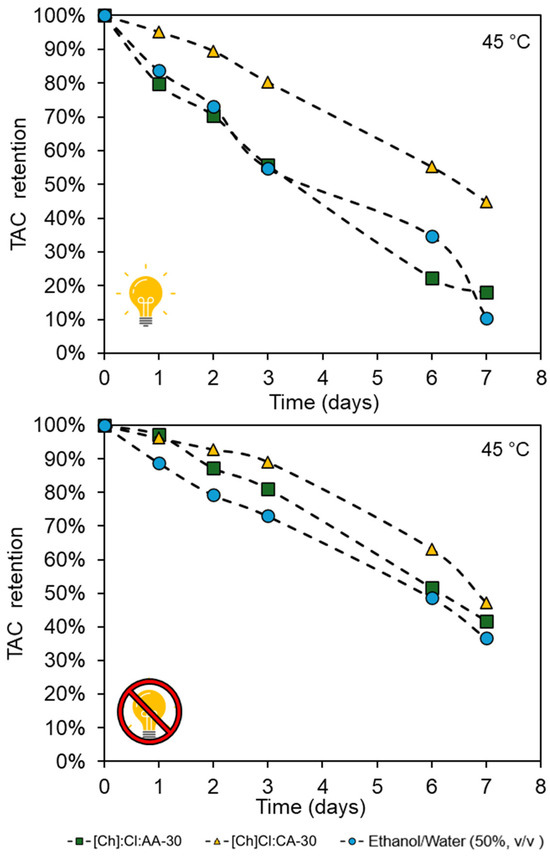 To determine if the eutectic mixtures can promote a protective effect on the anthocyanins, thermal stability in the presence and absence of light was evaluated at 25, 45, and 65 °C. In Figure 6, it is possible to see the kinetics curves for all solvents at 45 °C (for 25 and 65 °C, cf. Supplementary Material).