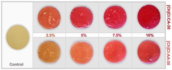 Eutectic mixtures of [Ch]Cl and organic acids are potential solvents for ready-to-use extracts. This work evaluated them as natural colorants for the development of gummy candies. These extracts can act as natural colorants, besides contributing to this product’s antioxidant activity. The final appearance of the gummy candies, with different extract concentrations, is shown in Figure 7.