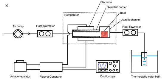 CP has the advantages of a low operating temperature, minimal energy consumption, effective bacterial inactivation, and no residues [15,16]. Therefore, it is favorable for use in food processing in low-temperature environments. CP is generated with air or inert gas under atmospheric or lower pressure. The methods of generating CP include dielectric barrier discharge (DBD), plasma jet corona discharge, radiofrequency plasma generation, and microwave plasma generation [16]. The high efficiency and low maintenance costs of DBD, together with easy access to air, make air-based DBD CP appealing for industrial use.