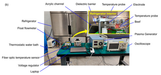 To evaluate the bacterial inactivation effect of CP at 4 °C and −18 °C, the DBD reactor was placed in a refrigerator (MR-BCD-CFG4MBXG, Qingdao Meilai Intelligent Technology Co., Ltd., Qingdao, China) with a temperature deviation of ±1 °C. To investigate the inactivation effect of CP at room temperature, the reactor was placed in the laboratory at 25 °C ± 1 °C, controlled by an air conditioner.
