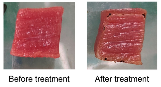 The samples were weighed, sealed in retort pouches, and immersed in a 75 °C water bath for 90 min. Then, the samples were cooled in an ice–water mixture. The cooking loss was determined via Equation (4):