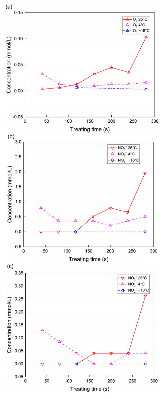 The substances in the PAW at different temperatures are shown in Figure 3. At 25 °C, the substances in the PAW accumulated with the discharge time, resulting in increased concentrations. Then, the substances in the PAW reached a plateau between 160 s and 240 s and started to increase at 280 s. The current results show that the concentrations of O3, NO3−, and NO2− in PAW at 25 °C were higher than those at −18 and 4 °C. At −18 °C, the concentrations of the above three components in the PAW were close to zero. At 4 °C, the O3 and NO3− in the PAW remained at a stable level with time. The concentration of NO2− decreased from 40 s to 160 s and started to increase at 240 s.