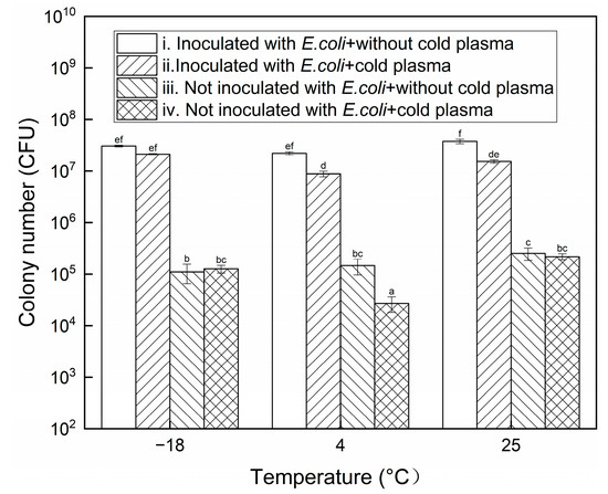 In the current research, the beef placed beside the electrodes was treated with CP. The bacterial inactivation results are shown in Figure 4 and Table S1 in the Supplementary Materials. The bactericidal efficacy of CP at 4 °C was the highest and that at −18 °C was the lowest. The lower inactivation rate at −18 °C might result from the low concentrations of reactive species in CP at this temperature, as described in Section 3.1. Although the concentrations of the substances at 4 °C were lower than those at 25 °C, the bactericidal efficacy was higher than that at 25 °C. At this temperature, the inactivation of the bacteria when the beef was not inoculated with E. coli was especially notable. The discrepancy between the inactivation effect and the substance concentration might be attributed to the significant effect of short-lived species in the inactivation process compared to long-lived reactive species [33]. Constrained by the equipment and budget, the short-lived species were not measured in the current study. The colony numbers of the samples not treated with CP and inoculated with E. coli or not showed no notable difference between 25 °C and −18 °C, indicating that freezing had no significant effect on the survival of the bacteria.
