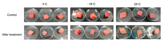 The appearance of the beef treated with and without CP is shown in Figure 5. The results of the quality indexes of the color, pH, shear force, and cooking loss for beef treated with and without CP are shown in Table 3. No significant differences existed in the L* of beef treated with and without CP at three typical temperatures. For the a* at 4 °C and 25 °C, the samples treated with CP showed significantly lower values. The reactive species in the CP reacted with the myoglobin in the beef and oxidized the pigment and lipids [24]. At −18 °C, there were no significant differences in the a* between the samples treated with CP and the untreated samples. One possible explanation is that insufficient reactive species were produced at lower temperatures, as indicated in Section 3.1. Another possible reason is that the ice on the surface of the beef inhibited the oxidation effect of the reactive species. For the index b*, samples treated with CP showed significantly lower values at 4 °C. However, at 25 °C and −18 °C, there were no significant differences in the b* of the samples treated with and without CP. Regarding the pH, shear force, and cooking loss, CP showed no significant influence at the three typical temperatures. The shear force and cooking loss at 4 °C were the lowest compared to the other two temperatures. Moreover, at 4 °C, CP showed the highest bactericidal efficacy with a minor influence on the a* of the beef, indicating that this was the most appropriate condition for the storage and sterilization of beef in this research. The investigation conducted by Moutiq et al. also showed that CP had no negative effect on the pH of chicken breast [23]. The hardness of Trachinotus ovatus also showed no significant change after treatment with CP without further storage [20].