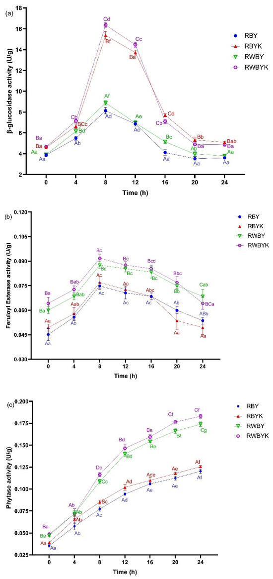 The changes in β-glucosidase (a), feruloyl esterase (b), and phytase (c) enzyme activity during single- and mixed-strain sourdough fermentation of red bean flour with or without wheat bran. RBY: red bean sourdough fermented by L. fermentum; RBYK: red bean sourdough fermented by L. fermentum and K. marxianus. RWBY: red bean–wheat bran sourdough fermented by L. fermentum. RWBYK: red bean–wheat bran sourdough fermented by L. fermentum and K. marxianus. Different lower-case and upper-case letters indicated significant differences at p < 0.05 for the same sample at different time of fermentation and different samples at the same time of fermentation, respectively.