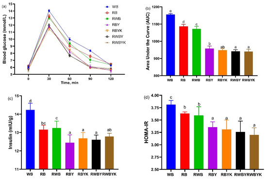 Effect of single- and mixed-strain-fermented red bean flour with or without wheat bran in bread diets on (a) oral glucose tolerance test, (b) average area under the curve (AUC), (c) fasting plasma insulin, and (d) homeostasis model assessment-insulin resistance (HOMA-IR) test of mice. The bars represented the mean ± SEM (n = 6), with the different letters signifying difference at p < 0.05. WB: wheat bread; RB: red bean flour bread; RWB: red bean–wheat bran bread; RBY: red bean sourdough fermented by L. fermentum bread; RBYK: red bean sourdough fermented by L. fermentum and K. marxianus bread. RWBY: red bean–wheat bran sourdough fermented by L. fermentum bread. RWBYK: red bean–wheat bran sourdough fermented by L. fermentum and K. marxianus bread.