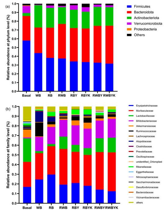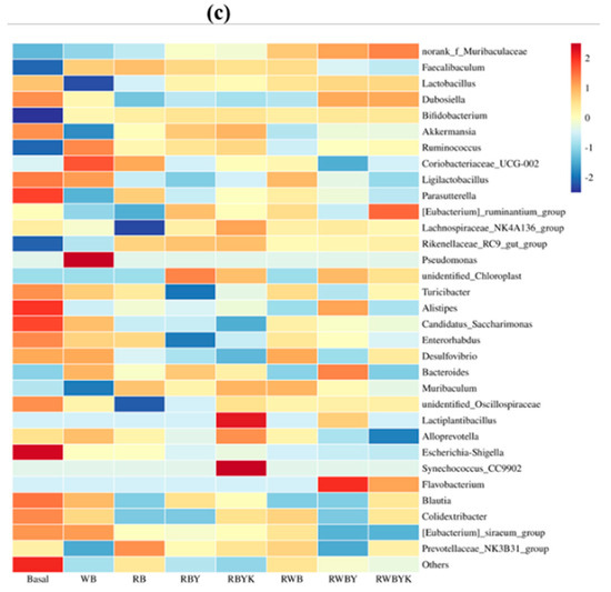 Effect of bread diets on the relative abundance of gut microbiota at, (a) the phylum level, (b) family level, (c) genus level in healthy mice. Basal: mice fed on AIN-93G diet; WB: wheat bread; RB: red bean flour bread; RWB: red bean–wheat bran bread; RBY: red bean sourdough fermented by L. fermentum bread; RBYK: red bean sourdough fermented by L. fermentum and K. marxianus bread; RWBY: red bean–wheat bran sourdough fermented by L. fermentum bread; RWBYK: red bean–wheat bran sourdough fermented by L. fermentum and K. marxianus bread.