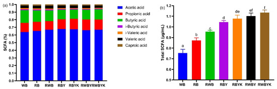 Individual short-chain fatty acids (SCFAs) content (a) and total SCFA content (b) in the feces of the mice following different diet intervention. The bars represented the mean ± SEM (n = 3), with the different letters signifying difference at p < 0.05. WB: wheat bread; RB: red bean flour bread; RWB: red bean–wheat bran bread; RBY: red bean sourdough fermented by L. fermentum bread; RBYK: red bean sourdough fermented by L. fermentum and K. marxianus bread; RWBY: red bean–wheat bran sourdough fermented by L. fermentum bread; RWBYK: red bean–wheat bran sourdough fermented by L. fermentum and K. marxianus bread.