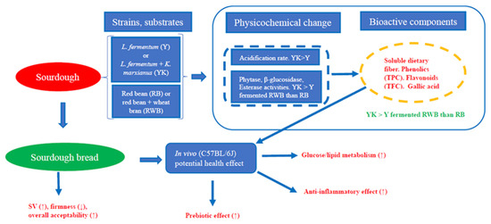 Therefore, the objective of this study was to investigate the effect of single (Lactobacillus fermentum) or mixed (Lactobacillus fermentum and Kluyveromyces marxianus) strain sourdough fermentation on the physicochemical characteristics such as anti-nutritional factors, total phenolic and flavonoid content, and dietary fiber composition of red bean with or without wheat bran flour. Changes in key enzymatic activities such as β-glucosidase, feruloyl esterase, and phytase during sourdough fermentation were reported. The quality of the corresponding breads based on specific volume, textural profile characteristic, and sensory evaluation were also reported. Furthermore, changes in lipid profile, glucose tolerance, insulin resistance, pro-inflammatory cytokine, short-chain fatty acids, and gut microbiota composition in healthy mice after 28 days of consuming the sourdough breads were also evaluated.