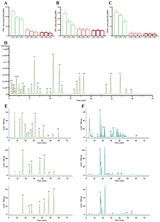 Total phenolics (A), total flavonoids (B), total procyanidins (C), LC-Q-TOF-MS extracted ions chromatogram (D), and HPLC profiles of mixed phenolic standards (E) and the presentative extract of discarded unripe kiwifruits (F). HA-YK, HS-YK, HY-YK, HA-MK1, HS-MK1, HY-MK1, HA-MK2, HS-MK2, and HY-MK2 indicate polyphenol-enriched extracts obtained from ‘Hongao’ (HA), ‘Hongshi’ (HS), and ‘Hongyang’ (HY) kiwifruit cultivars harvested at different maturation stages, including the immature stage (YK), mature stage (MK1), and overmature stage (MK2), respectively; compounds 1–33 are the same as in Table 1. Different lowercase letters (a–h) indicate statistically significant differences among different unripe, mature, and overripe kiwifruits (p < 0.05).