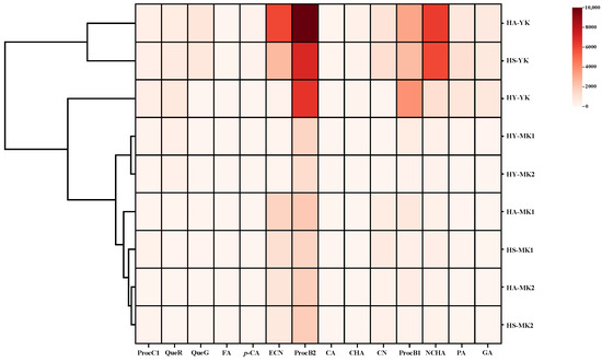 Hierarchical cluster analysis of phenolic compounds in polyphenol-enriched extracts obtained from different discarded unripe, mature, and overripe kiwifruits. HA-YK, HS-YK, HY-YK, HA-MK1, HS-MK1, HY-MK1, HA-MK2, HS-MK2, and HY-MK2 indicate polyphenol-enriched extracts obtained from ‘Hongao’ (HA), ‘Hongshi’ (HS), and ‘Hongyang’ (HY) kiwifruit cultivars harvested at different maturation stages, including the immature stage (YK), mature stage (MK1), and overmature stage (MK2); GA, gallic acid; PA, protocatechuic acid; NCHA, neochlorogenic acid; ProcB1, procyanidin B1; CN, catechin; CHA, chlorogenic acid; CA, caffeic acid; ProcB2, procyanidin B2; ECN, epicatechin; FA, ferulic acid; p-CA, p-coumaric acid; QueG, quercetin 3-O-glucoside; QueR, quercetin 3-orhamnoside; ProcC1, procyanidin C1.