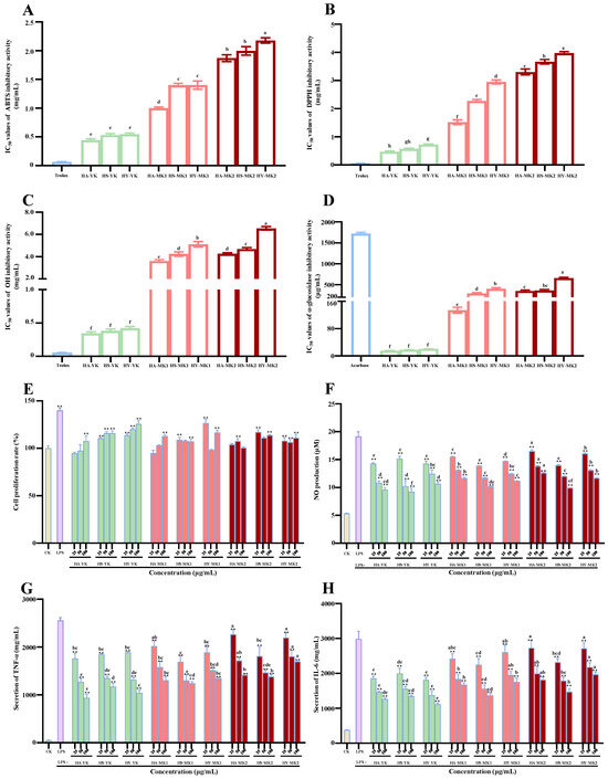 Antioxidant capacity (A–C), inhibitory effect on α-glucosidase (D), and anti-inflammatory activity (E–H) of polyphenol-enriched extracts obtained from different discarded unripe, mature, and overripe kiwifruits. (A), ABTS radical scavenging activity; (B), DPPH radical scavenging activity; (C), OH radical scavenging activity; (E), cell viability of RAW 264.7 macrophages; (F–H), the release of NO, TNF-α, and IL-6 from LPS-induced RAW 264.7 macrophages. HA-YK, HS-YK, HY-YK, HA-MK1, HS-MK1, HY-MK1, HA-MK2, HS-MK2, and HY-MK2 indicate polyphenol-enriched extracts obtained from ‘Hongao’ (HA), ‘Hongshi’ (HS), and ‘Hongyang’ (HY) kiwifruit cultivars harvested at different maturation stages, including the immature stage (YK), mature stage (MK1), and overmature stage (MK2); different letters (a–h) indicate statistically significant differences (p < 0.05) among different discarded unripe, mature, and overripe kiwifruits; significant differences in the cell viability of LPS and kiwifruit extracts vs. control are shown by ** p < 0.01. Significant differences in NO production, secretion of IL-6, and secretion of TNF-α in kiwifruit extracts vs. LPS are shown by ** p < 0.01.