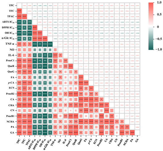 Pearson correlation matrix for total polyphenols, individual phenolics, antioxidant capacity, inhibitory effect on α-glucosidase, and anti-inflammatory activity. TPC, total phenolic content; TFC, total flavonoid content; TPAC, total procyanidin content; GA, gallic acid; PA, protocatechuic acid; NCHA, neochlorogenic acid; ProcB1, procyanidin B1; CN, catechin; CHA, chlorogenic acid; CA, caffeic acid; ProcB2, procyanidin B2; ECN, epicatechin; FA, ferulic acid; p-CA, p-coumaric acid; QueG, quercetin 3-O-glucoside; QueR, quercetin 3-orhamnoside; ProcC1, procyanidin C1; ABTS IC50, DPPH IC50, and OH IC50 indicate IC50 values of ABTS, DPPH, and OH radical scavenging activity, respectively; α-Glc IC50 indicates IC50 values for the inhibition of α-glucosidase; NO, IL-6, and TNF-α indicate NO, IL-6, and TNF-α produced from LPS-stimulated RAW 264.7 cells, respectively; Significant correlations are shown by * p < 0.05, ** p < 0.01, and *** p < 0.001.
