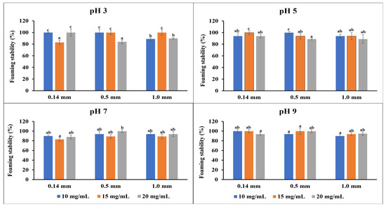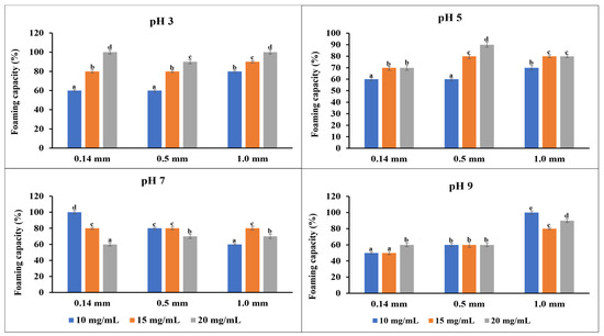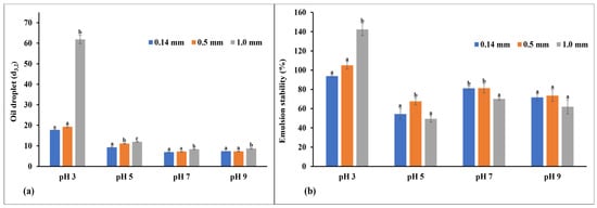 The stability of the emulsion after allowing the emulsion to rest for 30 min undisturbed is shown in Figure 2b. At pH 3, the 0.14 mm and 0.5 mm flour exhibited a significantly reduced (p < 0.05) emulsion stability compared to the 1.00 mm particle size. At a pH 5, the medium particle size flour possessed a significantly higher (p < 0.05) stability than the fine and coarse particle sizes. However, at pH 7, the medium and fine particle size flours were more stable (p < 0.05) than the coarse particle size. At pH 9, the flours were stable in a similar pattern. The results suggest that varying the fava bean flour particle size affects emulsion stability. Overall, the fine and medium particle size flours tend to produce more stable emulsions, irrespective of the pH, which may be due to the smaller oil droplet sizes. Also, the smaller particle size flours had a more stable emulsion because of the increased surface area for protein adsorption, and the increased protein content in these smaller particle sizes ensures the stability of the emulsion interface [46,47,48].