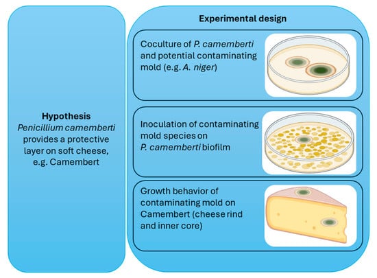This study examines the effects of fungal–fungal cocultures, which lead to a shift in secondary metabolite production [15]. The key questions are whether these metabolic alterations adversely affect edible mold species, such as Penicillium camemberti, and whether an excess of Penicillium camemberti potentially acts as a protective layer for cheese.