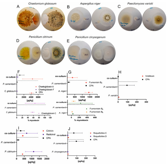 The growth behaviors of five mold strains in the presence of Penicillium camemberti were documented in photographs, as shown in Figure 2A–E. Fungal mycotoxin production is shown in Figure 2F–J and is summarized in Table 1.