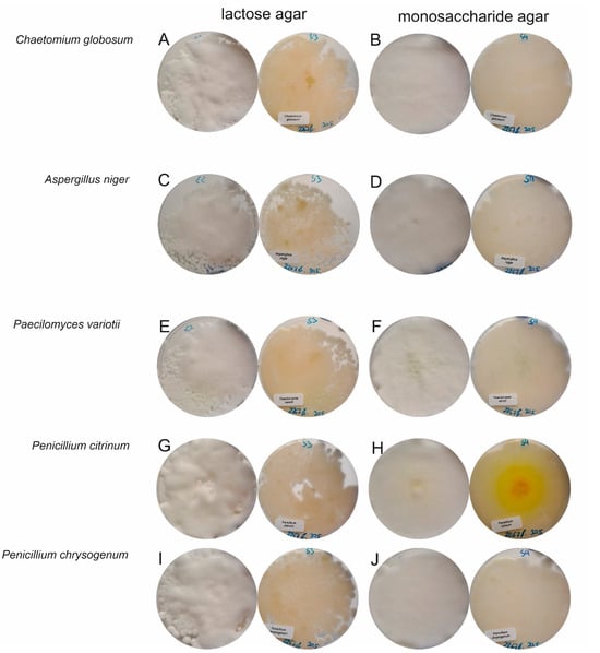 Fourteen days of biofilm cultivation of Penicillium camemberti and five contaminating species, namely, Chaetomium globosum, Aspergillus niger, Paecilomyces variotii, Penicillium citrinum, and Penicillium chrysogenum, on two types of customized agar with either lactose or monosaccharides as the carbon source. The top view is on the left-hand side of each panel, and the bottom view is on the right-hand side of each panel. (A,B) Chaetomium globosum, (C,D) Aspergillus niger, (E,F) Paecilomyces variotii, (G,H) Penicillium citrinum, (I,J) Penicillium chrysogenum.
