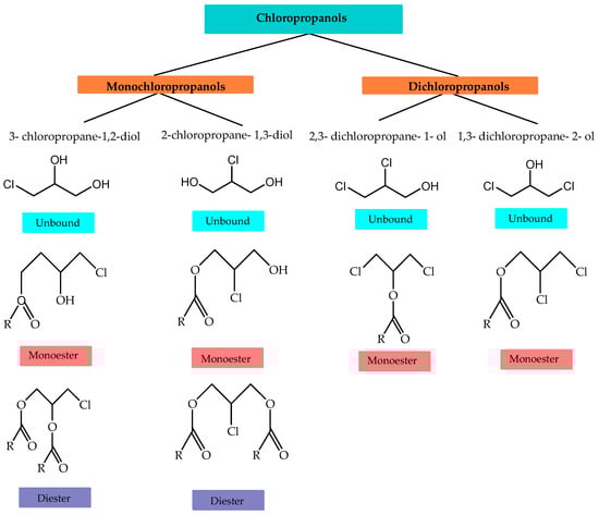 Since the inception of food processing, chloropropanol derivatives have been found in foods, but the free form of 3-MCPD was first identified in acid-hydrolyzed vegetable proteins (acid-HVPs) in 1978 []. The esterified derivative of 3-MCPD, conjugated with fatty acids, was identified in 1980 []. In 2006, the presence of 3-MCPD esters in refined vegetable oils was confirmed, and the fatty acid ester configurations of MCPDs were identified as process contaminants []. In December 2007, 3-MCPD esters were identified in high amounts in infant formulas []. Their presence was also observed in human breast milk []. Later, high quantities of 3-MCPD have been found in a wide range of heat-treated foods, including meat products, milk and dairy products, cereal-derived products, coffee, fried cheese, biscuits, and smoked foods []. While the formation of bound 2- and 3-MCPD, as well as glycidyl fatty acid esters (GEs), typically occurs during the deodorization process in the refining of oils and fats, free MCPD is usually produced during the process of roasting and smoking [].