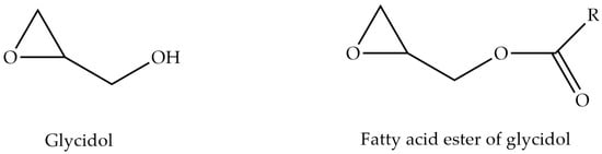 Glycidol, also known as 2,3-epoxy-1-propanol, is a colorless liquid that is soluble in water and most polar solvents. It has a molecular formula of C3H6O2 (Figure 2) and a molecular weight of 74.08 g/mol. It is an odorless liquid cyclic ether. Glycidol has a single hydroxyl group and forms only monoesters []. GE is another food process contaminant derived from refined oil. It contains an epoxide group esterified with fatty acids. Even though GE and MCPD esters are evaluated concurrently by researchers on account of their structural similarities, it is hypothesized that these compounds may exhibit distinct toxic effects because of the varying functional groups they possess [,,].
