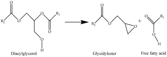 Chloropropanols are known to be formed during food processing. The formation of 3-MCPD esters has been reported to occur through primary reactions during food processing in the presence of chlorine. This reaction occurs when foods that have a high fat and salt content are subjected to heat treatment. The synthesis of MCPD esters is primarily influenced by chlorine ions, acylglycerols, temperature, and time. On the other hand, GEs are formed under acidic conditions and high temperatures, primarily by monoglycerides and diglycerides []. The formation mechanism of GE under thermal conditions is illustrated in Figure 3 []. GE is mostly formed from diacetylglycerol during the deodorization process in the physical refining of oils, specifically at temperatures above 200 °C []. The hydrolysis of esters into their free forms, 3-MCPD and 2-MCPD, is facilitated by the lipase enzyme secreted by the pancreas in the intestinal system [].