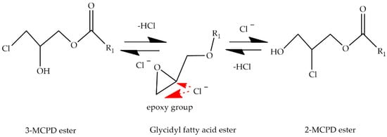 There are three hypothesized mechanisms for the formation of 3-MCPD in foods: acid hydrolysis, heat treatment, and lipase activity releasing it from its esters. 3-MCPD is generated through the chemical reaction between cooking oils and acid. The raw material contains HCl, triacylglycerols, phospholipids, and glycerol, which serve as precursors for the formation of chloropropanols []. The process of hydrohydrin production through the reaction of hydrochloric acid (HCl) and glycerol was initially documented by Velisek et al. []. In a later study, Hamlet et al. [] put forward a mechanism that elucidates the heat-induced formation of chloropropanols from triacylglycerols in acidic environments. The crucial step in this mechanism entails the nucleophilic substitution of acyl groups with chlorine ions, which are activated by neighboring ether groups. The resulting intermediate is the chloropropanediol diester that yields chloropropanols under hydrolytic conditions. 3-MCPD can also be formed through a process of heat treatment in the absence of acid-HVP. The presence of this phenomenon has been observed in sodium chloride and lipid-containing foods during cooking methods such as grilling and baking. The release of free glycerol occurs through the high-temperature hydrolysis of triglycerides. This free glycerol has the potential to react with chlorine content [,]. Many researchers have demonstrated that 3-MCPD, 2-MCPD, and GE are formed during oil refining, and it has been stated that the deodorization process, particularly at high temperatures, plays an important role in their formation [,,,,,,]. The conversion mechanism of 2-MCPD, 3-MCPD, and GE among each other is illustrated in Figure 4.