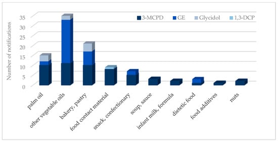 The Rapid Alert System for Food and Feed (RASFF) reported a total of 54 notifications on 3-MCPD between the years 2020 and 2023. Most of these notifications were related to vegetable oils. A total of 36 notifications were documented for GE, whereas nine notifications were recorded for glycidol, and two notifications were recorded for 1,3-DCP. It should be noted that there were no recorded notifications for any chloropropanol compounds before the year 2020. The presence of chloropropanol has gained attention subsequent to the publication of the EFSA report. However, an analysis of the distribution of notifications over the years reveals a lack of comprehensive global efforts for mitigation. The number of RASFF notifications on chloropropanols, GE, and glycidol by product category during the period 2020–2023 is presented in Figure 5. Palm oil and other vegetable oils are the primary sources of food containing chloropropanol, followed by bakery and pastry products. The presence of 1,3-DCP is limited to food contact materials, while there is no available information regarding 2-MCPD and 2,3-DCP, potentially due to the absence of regulatory thresholds [].
