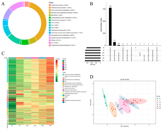 Identification of metabolites of Yanbian cattle during postmortem dry-aging process. FA, fatty acyls; GP, glycerophospholipids; SL, sphingolipids. “Others” include 10-deoxyformamycin, 8,8-deoxy-oleane, betaine, butenoyl-PAF, genipin, heterodendrin, hydroxyurea, and α-asarone. (A) Ring chart showing the proportions of all metabolite categories. (B) Advanced Venn diagram of metabolites at various stages of the dry-aging process (0 d, 7 d, 14 d, 21 d, 28 d, and 35 d). (C) Heat map of metabolites during the dry-aging process. (D) The score plots of principal component analysis.
