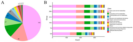 Differential metabolites analysis of Yanbian cattle during the dry-aging process (0 d, 7 d, 14 d, 21 d, 28 d, and 35 d). (A) Pie chart showing the distribution of the 373 different metabolites. (B) Bar plot showing the quantity and classification of various metabolites based on dry-aging times.