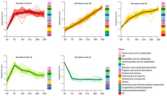 To better study the changing trend of metabolites during the dry-aging process in Yanbian cattle, the K-means clustering algorithm was applied; we can categorise the 373 metabolites into five different groups based on their accumulation patterns. (Figure 3, Supplementary Data 3). With the dry-aging time extension, the metabolite composition of beef changed markedly. The results showed that the differential metabolites of subclass 4 (including 45 differential metabolites, with the largest proportion of GPs) showed a trend of rising first and then reducing with dry-aging time, whereas the differential metabolites of subclass 5 (including 20 differential metabolites) decreased on day 7 and tended to remain stable throughout the remainder of the process of aging. The remaining 308 metabolites rose in different trajectories during the dry-aging process.