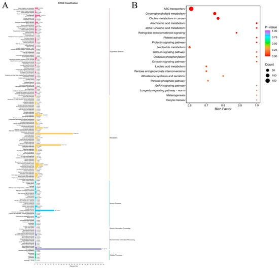 KEGG pathway analysis of differential metabolites during the dry-aging process in Yanbian cattle. (A) Annotations of the KEGG pathway for 373 different metabolites. (B) The top 20 KEGG enrichment pathways of different metabolites.