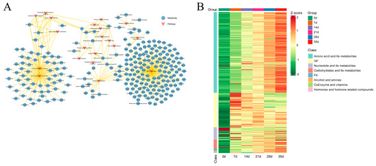The transformation path of annotated metabolites during the dry-aging process of Yanbian cattle. (A) Network diagrams and heat map (B) of the annotated differential metabolites of the top 20 KEGG enrichment.