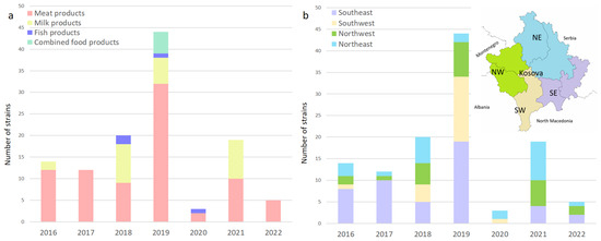 (a) Distribution of L. monocytogenes over the years in meat products, milk products, fish products, and combined products; (b) map showing the geographic location of sampling sites. Regional location of the sampling sites among business operators in Kosovo, with purple bars in the southeast (SE), brown in the southwest (SW), green in the northwest (NW), and blue in the northeast (NE).