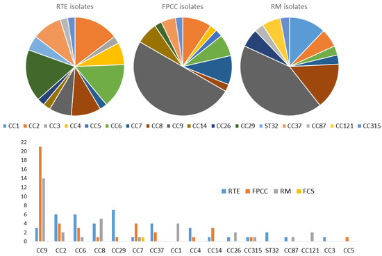 Notably, 14 out of the 17 clonal complexes were identified by real-time PCR from 41 RTE isolates. However, CC29, CC2, and CC6 were the most dominant, with seven CC29, followed by six samples in each of the CC2 and CC6 clonal complexes. By contrast, CC9 by far was the most detected clonal complex in both FPCC (21) and RM (14). Thirteen groups of clonal complexes were identified from meat product-only isolates. In total, 35 out of the 82 meat product isolates expressed CC9, which was the most represented clonal complex in this group, followed by CC6, which was expressed by 9 isolates; CC8 by 7 isolates; and CC2, expressed by 5 isolates. Notably, 11 groups of clonal complexes were identified from the 25 samples from milk products only. CC29 was identified in six isolates, followed by CC2 in five, while CC9 was only detected in two isolates. Three of the four isolates from fish products belonged to CC2, with two samples, and CC26 and CC87 with only one each. From the four groups of clonal complexes isolated from combined food products, we found that CC121, which we did not detect in any other food category, was expressed by two isolates, whereas CC6, CC8, and CC9 were expressed by one isolate each (Table 2 and Figure 2).