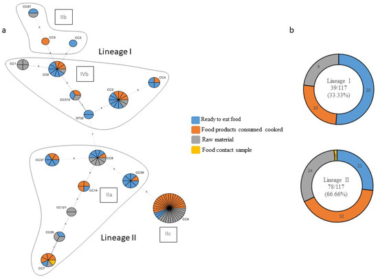 (a) The minimum spanning tree (MST) of multilocus sequence typing (MLST) clonal complexes (CCs) of the 117 L. monocytogenes strains included in the study panel. Each CC is indicated by a circular node whose size reflects the number of strains. The CCs used to build the MST were obtained by an MLST alternative method, which provides only the CC, to build the MST; the smallest ST allelic code within the CC was used. The numbers along the node connecting the lines indicate the number of allelic differences between them. The color reflects the food chain category: ready to eat food in blue, food products consumed cooked in orange, raw material in grey, and food contact sample in yellow. Each delimited area groups the CCs belonging to the same molecular serotype, indicated in a black frame; (b) strain distribution according to the lineage and type of food sector.