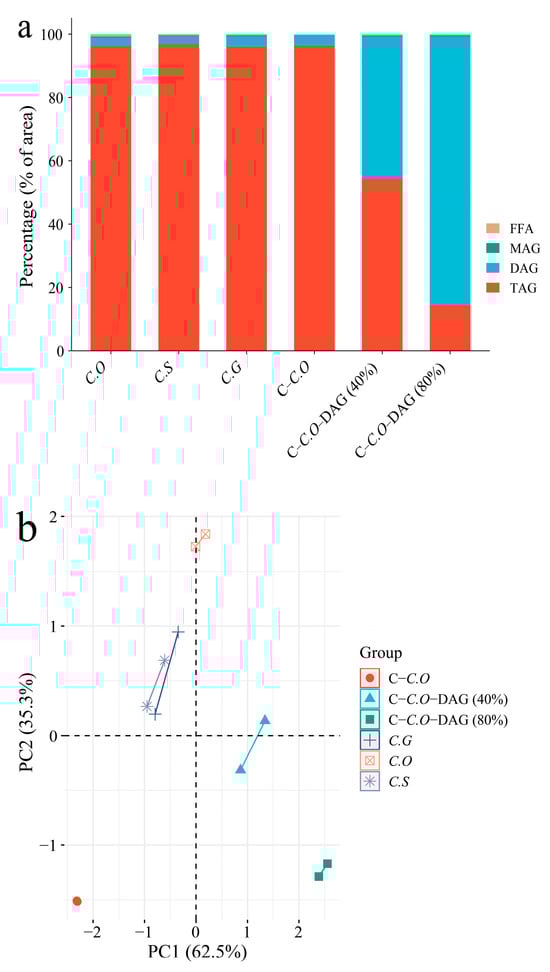 Furthermore, by utilizing the composition of TAG, DAG, MAG, and FFA as variables for principal component analysis (PCA) (Figure 1b), it can be clearly distinguished that the three varieties of camellia oil (C.O, C.S, and C.G) differ from commercial refined camellia oil (C-C.O) and DAG-enriched camellia oils [C-C.O-DAG (40% and 80%)]. This suggested that the glyceride distributions can serve as useful markers for distinguishing between different types of camellia oils.