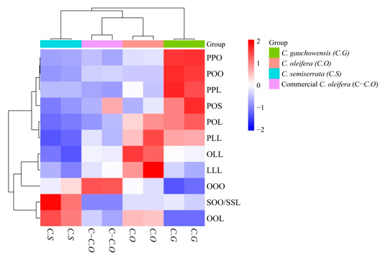 The cluster analysis, which employed dimensionality reduction using the TAG profiles, was undertaken to address the shielding effect resulting from the absolute dominance of major TAGs. The results are illustrated in Figure 2, revealing distinct characteristics for each camellia oil variety. C.O was notably enriched in PLL, OLL, and LLL. In contrast, C.G exhibited a preference for PPO, POO, and PPL, suggesting a different fatty acid composition compared to C.O. Furthermore, the major TAG in C-C.O was OOO, while C.S showed higher levels of OOL and SOO/SSL. These findings suggested that the TAG profiles of each camellia oil variety can serve as unique fingerprints for differentiating and evaluating the characteristics of different types of camellia oils. Similarly, Wei et al. [17] showed that a distinct pattern of TAG spectra for vegetable oils was obtained, allowing for the classification of 18 edible vegetable oils into five groups based on their TAG profiles.