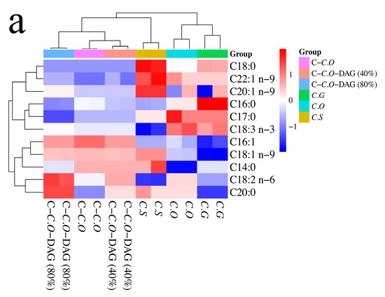 The distribution characteristics of fatty acids in different varieties of camellia oils and DAG-enriched camellia oils were analyzed using cluster heat map and principal component analysis (PCA) with the distributions of fatty acids on different glycerol backbones as variables, as shown in Figure 3. The results revealed distinct groupings among the six types of oils based on their total fatty acid composition. Firstly, C.O and C.G form one group, characterized by relatively high levels of palmitic acid (C16:0), α-linolenic acid (C18:3 n-3), and margaric acid (C17:0). Secondly, C-C.O and its DAG-enriched counterparts (C-C.O-DAG 40% and 80%) form another group with relatively high levels of palmitoleic acid (C16:1) and linoleic acid (C18:2 n-6). Lastly, represented by C.S, it exhibited higher levels of n-9 fatty acids (C18:1 n-9, C20:1 n-9, and C22:1 n-9) and SFAs (C14:0, C18:0, and C20:0) (Figure 3a). Accordingly, the results of PCA using total SFAs, MUFAs, and PUFAs as variables showed that C.O, C.S, and C.G were characterized by high levels of SFA among different types of camellia oils. In contrast, total MUFAs and PUFAs were representative of C-C.O and its DAG-enriched counterparts, especially C-C.O-DAG 40% and 80% (Figure 3b), suggesting that the relative content and saturation of fatty acids in camellia oil can be used as indicators to distinguish different types of camellia oil [20,45]. For instance, Shi et al. [20] demonstrated that the content of oleic acid (C18:1 n-9) in C. oleifera (77.12–79.50%) and C. chekiangoleosa (75.97–79.33%) was significantly higher compared to C. sinensis (49.07–56.27%) (p < 0.05). Conversely, the content of palmitic acid (C16:0) in C. oleifera (8.37–8.92%) and C. chekiangoleosa (7.45–9.06%) was notably lower than in C. sinensis (13.52–17.55%).